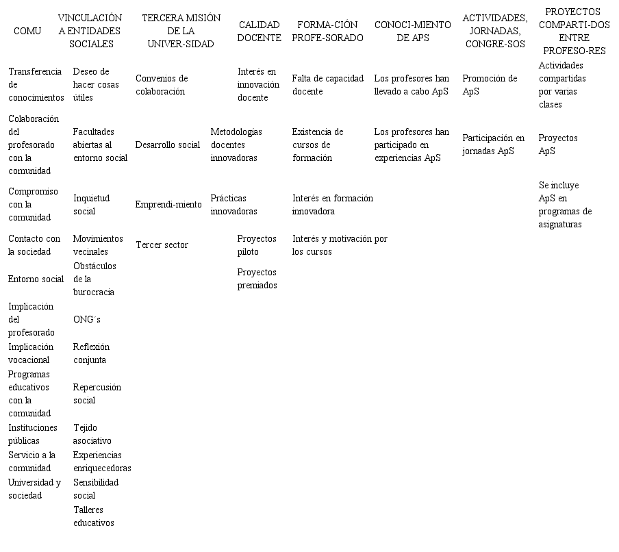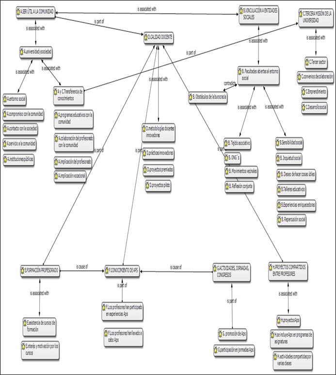 También se estableció que "vincular a las entidades sociales" se asociaba con "ser útil a la comunidad" e incluía los siguientes códigos: "deseo de hacer cosas útiles", "facultades abiertas al entorno social", "malestar social", " movimientos de barrio "," obstáculos de la burocracia "," ONGs "," reflexión conjunta "," repercusión social "," red asociativa "," experiencias enriquecedoras "," sensibilidad social "y" talleres educativos ".