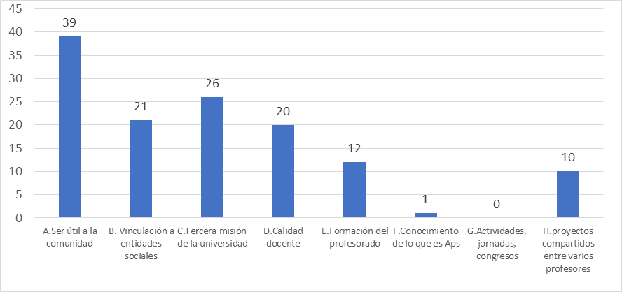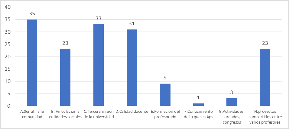 Sin embargo, una vez que se señala lo anterior, se debe profundizar el análisis de los datos obtenidos, y lo primero que nos sorprende es el hecho de que los decanos tienen poco y, en algunos casos, casi ningún conocimiento sobre SL. Incluso en la rama de Ciencias Sociales y Jurídicas, que incluye programas de grado de Educación, el conocimiento de lo que significa esta metodología de enseñanza y aprendizaje es limitado, teniendo en cuenta el importante número de proyectos que se están llevando a cabo en diversas materias de las áreas involucradas. El pequeño número de actividades de formación docente, que pueden estar relacionadas con proyectos de SL, planificadas en diferentes centros es otro ejemplo notable.