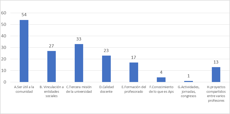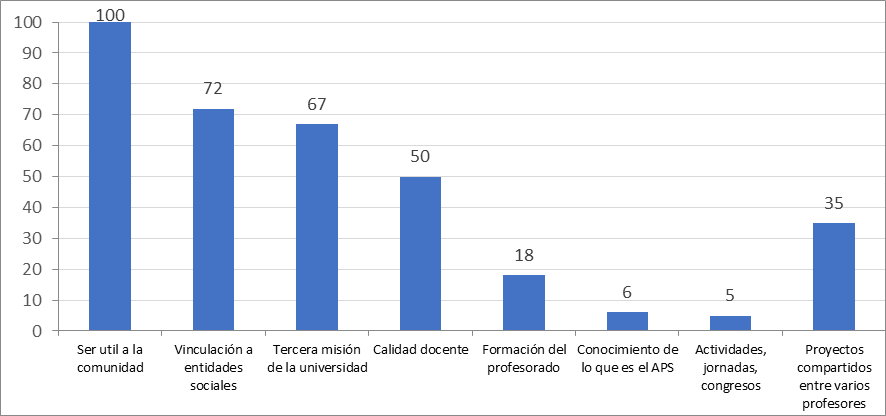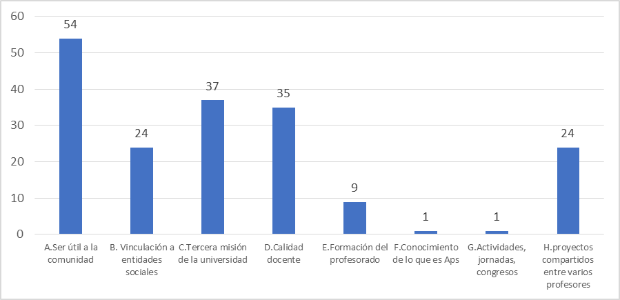 Cabe señalar que, en general, las universidades expresaron regularmente y, de una forma u otra, el deseo de "ser útiles a la comunidad" (282). También vale la pena señalar su interés en responder a la "tercera misión de la universidad" (196) y "vincularse a entidades sociales" (167). También hubo cierta densidad en los códigos relacionados con la búsqueda de "calidad de enseñanza" (159). Los códigos de menor densidad fueron los relacionados con el "conocimiento de SL" (12) y la ejecución de "actividades o conferencias para la difusión de esta metodología de enseñanza" (10).