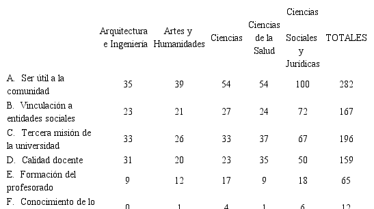 Por otro lado, el aspecto más relevante de nuestra investigación es que el 80.72% de los códigos establecidos están agrupados en cuatro dimensiones: "Ser útil para la comunidad", "Tercera misión de la universidad", "Vincular a entidades sociales" y " Enseñanza de calidad "; también existe un equilibrio entre las diferentes áreas de conocimiento, en el sentido de que todas ellas tienen un número significativo de indicadores en las cuatro dimensiones mencionadas anteriormente. A partir de esta información, se puede deducir que, según los códigos que abarcan, y de acuerdo con la percepción de los decanos, en el contexto universitario existe una conciencia clara de que es útil para la comunidad; las facultades y las escuelas universitarias deben estar abiertas a la sociedad y al entorno en que se encuentran; la colaboración es necesaria con las entidades sociales regionales, como las ONG, las asociaciones de vecinos, las entidades culturales, etc.; dicha colaboración puede ser muy enriquecedora tanto para profesores como para estudiantes; la universidad tiene la obligación de devolver a la sociedad parte de lo que se necesita, en forma de transferencia de conocimiento, estrategias y valores; Se necesitan metodologías de enseñanza refrescantes, prácticas transformadoras, proyectos innovadores, ya que tienen un impacto positivo en la calidad y relevancia de la enseñanza universitaria.