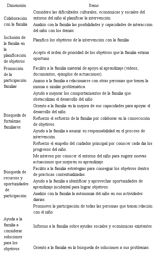 En los ítems dedicados a las prácticas participativas del profesional, cuyos resultados son los que se presentan en este estudio, se repartieron en 10 dimensiones teóricas, que pueden inferirse de la literatura consultada (Dunst, 2002; Dunst y Trivette, 1996; Escorcia et al., 2016): colaboración con la familia (2 ítems), inclusión de la familia en la planificación de objetivos (2 ítems), promoción de la participación familiar (2 ítems), búsqueda de fortalezas familiares (5 ítem), búsqueda de recursos y oportunidades de participación (5 ítems), ayuda a la familia a considerar soluciones para los objetivos propuestos (2 ítems), apoyo a las decisiones de la familia (3 ítems), trabajo flexible e individualizado (2 ítems), atención a las necesidades y prioridades de la familia (2 ítems) y enfoque de trabajo positivo (1 ítem). La redacción específica de los ítems queda recogida, a continuación, en la Tabla 1.