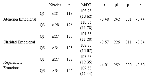 En la Tabla 4 se muestran, atendiendo a los resultados en Atención Emocional, las medias y las deviaciones típicas de las respuestas de los profesionales en las diez dimensiones de prácticas participativas. Se consideraron las respuestas los 128 profesionales con puntuaciones ≤21 en la habilidad de Atención Emocional (Q1) y los 126 profesionales con puntuaciones ≥28 en dicha habilidad (Q3). Además, se presentan los resultados de la prueba t de Student para el contraste de las medias y el estadístico d de Cohen para valorar el tamaño del efecto.