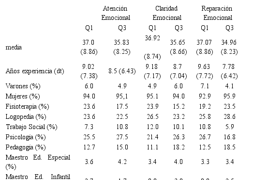 Las características de los profesionales de los dos grupos de puntuaciones más altas (Q3) y bajas (Q1) en las habilidades de inteligencia emocional se presentan en la Tabla 3. Se observa que presentan valores equiparables en las distintas variables sociodemográficas consideradas.