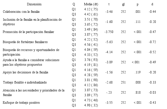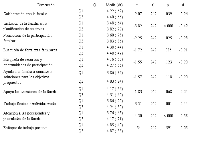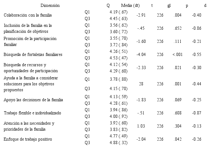 En la dimensión Reparación Emocional, también los profesionales situados en el tercer cuartil puntúan más alto que sus compañeros del cuartil uno en la valoración que hacen de sus prácticas participativas con las familias. En esta ocasión, se obtienen diferencias estadísticamente significativas en siete de las diez dimensiones que se contemplan en las prácticas participativas, lo que supone el 70% de estas dimensiones. En concreto, estas dimensiones son: colaboración con la familia (p= .001), promoción de la participación familiar (p= .001), búsqueda de fortalezas familiares (p= .001), búsqueda de recursos y oportunidades de participación (p= .001), ayuda a la familia a considerar soluciones a los objetivos propuestos (p≤ .000), trabajo flexible e individualizado (p= .008) y enfoque de trabajo positivo (p= .001). Los resultados de la prueba d de Cohen indican que el tamaño del efecto es mayoritariamente moderado, alcanzando un tamaño del efecto grande en la dimensión de búsqueda de fortalezas familiares (-0.72).