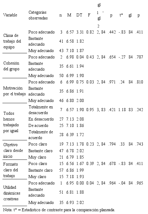 Se calcularon estadísticos descriptivos para las variables explicativas. Se relacionó la Calificación del Trabajo en Grupo con los grupos formados por las variables Clima de trabajo del equipo, Cohesión del grupo, Motivación por el trabajo, Trabajo repartido por igual, Objetivo claro desde inicio, Formato claro del trabajo, y Utilidad de las dinámicas creativas, mediante ANOVA de un factor. Además, puesto que algunas categorías fueron elegidas por muy pocos individuos (concretamente las que indicaban poca adecuación, acuerdo o claridad), se repitió el análisis mediante comparaciones planeadas (Pardo & San Martín, 2010, p. 217), comparando la categoría que indicaba mayor acuerdo con todas las demás tomadas en conjunto.