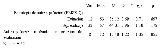 Del total de la muestra, se recogieron datos de los dos factores del EMSR-Q (Aprendizaje y Evitación) en 52 estudiantes. Para estos sujetos también se calculó el total de Autorregulación en los criterios de evaluación para el trabajo en grupo. Las tres variables fueron aproximadamente normales (ver Tabla 2).