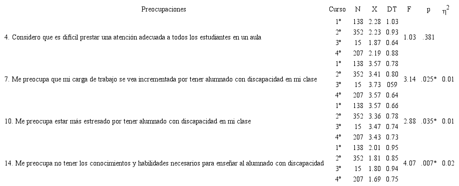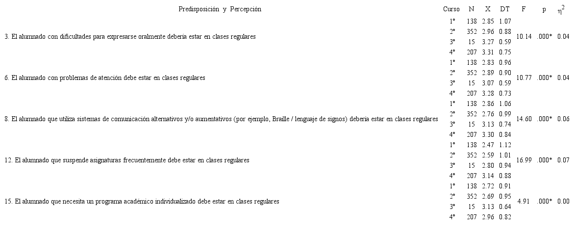 En función del “curso” se hallaron diferencias estadísticamente significativas en todos los ítems (p<.05) (Tabla 4); pues los estudiantes de los últimos cursos mostraron una mejor predisposición hacia la inclusión educativa, es decir, apostaban más por la educación en aulas ordinarias o regulares para el alumnado con los problemas y/o necesidades: orales (ítem 3), de atención (ítem 6), comunicativos, usuarios de sistemas alternativos de comunicación (ítem 8), repetidores (ítem 12) y que precisan programas individualizados (ítem 15). Las pruebas post hoc Tukey y Bonferroni evidencian que las diferencias se producen entre los cursos finales, mayormente en el último curso (4º) y los iniciales, más pronunciadas con el primer curso (1º). En efecto, las medias de respuestas a los ítems de este factor de predisposición superan el valor 3 etiquetado como “de acuerdo” en los alumnos de 4º curso (3.31, 3.28, 3.30, 3.14 y 3.46 en los ítems anteriores), e incluso de curso 3º (3.27, 3.07, 3.13, 2.80 y 3.13, respectivamente), mientras que en los cursos iniciales no superan en ningún caso el valor 3: curso 1º (2.85, 2.83, 2.86, 2.47 y 2.72) y curso 2º (2.96, 2.89, 2.76, 2.59 y 2.69, respectivamente). Se desprende de ello que tras el decurso universitario y las prácticas externa (3º y 4º) el estudiantado de los distintos grados de magisterio mejora su actitud inclusiva.
