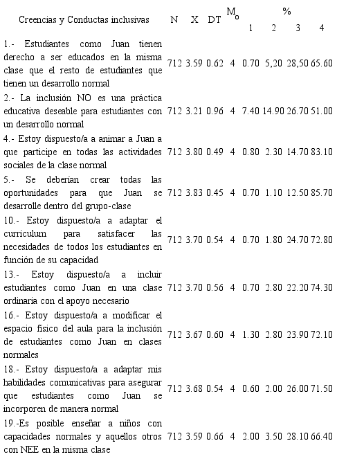 Resultados sobre Creencias y predisposición comportamental hacia la inclusión