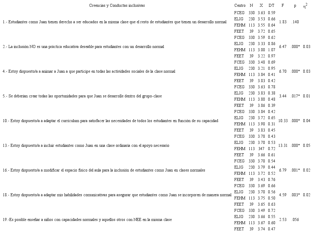 Atendiendo al “centro”, se hallaron diferencias significativas (p<.05) en el ítem 3, F(3, 708)=5.53; p=.001, η=0.02; en el 6, F(3, 708)= 3.64; p=.013, η=0.02 y en el 12, F(3, 708)= 8.03; p=.000, η=0.03. En los ítems 3 y 6 las diferencias se produjeron entre la FCEG, donde muestran mejor disposición hacia la inclusión educativa (medias: 3.18 y 3.12, respectivamente), y la EIG (medias: 2.96 y 2.90). En los ítems 3 y 12 se producen entre la FCEG (medias: 3.18 y 2.90) y la FEHM (medias: 2.84 y 2.45). Por último, también entre la FCEG y la FEET se hallaron diferencias en el ítem 12: 2.90 vs. 2.34. Estas diferencias se manifiestan significativas tanto en la prueba de Bonferroni como Tukey, a un nivel de significación del 0.05. Puede resaltarse que la inclusión educativa se halla más desarrollada entre el alumnado de la FCEG, y que los ítems 3 y 12, referidos a alumnado con problemas orales y repetidores son los que generan mayor confusión o heterogeneidad de sus repuestas respecto de la integración en aulas regulares.