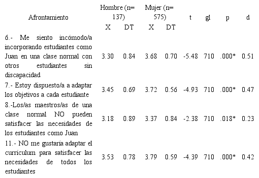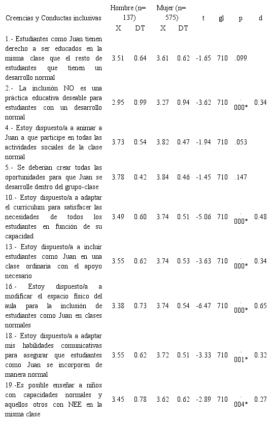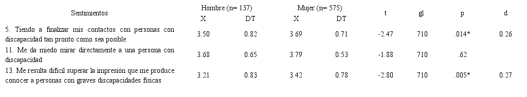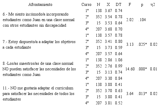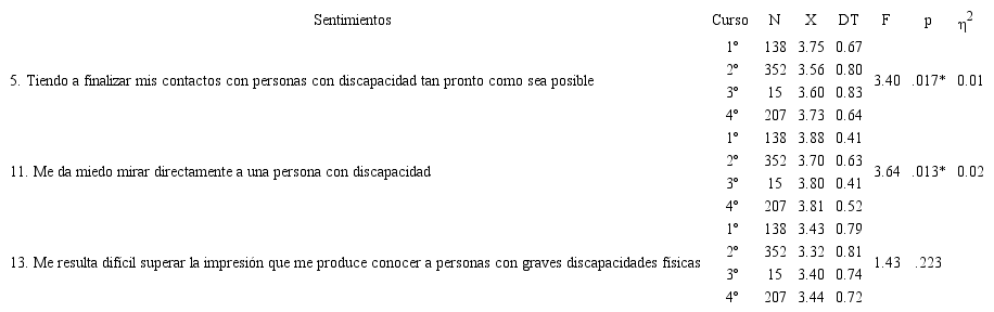 No aparecieron diferencias significativas de acuerdo con las variables: “presencia de NEE”, “contacto”, “edad”, “centro de estudios” y “titulación”. Sí resultaron significativas (p<.05) las diferencias entre las respuestas otorgadas por los estudiantes de distinto “sexo” y “curso”.