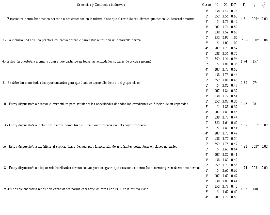 Idéntica intensidad derivo del “curso” de los participantes (Tabla 14). En la mayoría de los ítems (66.67%: 1, 2, 10, 13, 16 y 18) quedó probado que los cursos superiores muestran unas creencias más proclives para la inclusión educativa, siendo los del curso último los que provocan estas diferencias significativas respecto del primero, según los estadísticos de Tukey y Bonferroni, ocupando el último curso un subconjunto homogéneo diferente al resto.