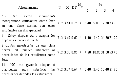 De otra parte, se observó que las actitudes fueron mejores cuando se preguntaba por casos de alumnos concretos, con nombre y dificultad, puesto que los resultados obtenidos estuvieron por encima de los obtenidos utilizando situaciones más abstractas (3,08 versus 3,60). De ello se deduce, como implicación pedagógica, que se requiere la generalización de sus actitudes para interiorizarlas a nivel abstracto y no solo concreto, y, como implicación didáctica, que el trabajo con casos concretos puede constituir la base para el éxito de la misma.