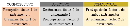 No obstante, se requiere conocer en profundidad y, en su caso, acometer acciones de mejora y cambio, para lo que se debe acudir a los preliminares que la accionan. Uno de sus componentes intrínsecos, aunque mediatizado por el contexto y la experiencia, es el actitudinal. La actitud invita y camina hacia una percepción y acción, en tanto que predispone mentalmente, y, por tanto, condicionante, en gran medida, de la conducta y respuesta. Actitud y acción son, pues, las dos “caras” de la conducta (Hwang & Evans, 2011). También está, a su vez, configurada por aspectos previos intrínsecos y extrínsecos, y también es cambiante, total o parcialmente, en tanto que es aprendida, si bien resulta perdurable. Se compone de 3 dimensiones (Rodríguez, Caurcel & Alain, 2019): cognoscitiva, afectiva y conductual. De ahí que se estudien con frecuencia diferentes aspectos de los anteriores como los prejuicios, miedos y contactos, respectivamente. En esta investigación se apuesta por indagar la totalidad de los aspectos derivados del modelo y que nos proporcionan los instrumentos seleccionados ex profeso: con el primer instrumento la predisposición (dimensión 3), percepción (dimensión 1), sentimientos (dimensión 2), preocupaciones (dimensión 2), y con el segundo las creencias (dimensión 1), pre-comportamientos (dimensión 3) y afrontamiento (dimensión 3) (Figura 1).