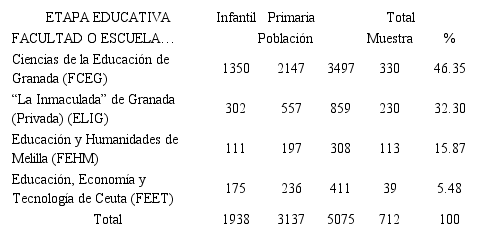 Partiendo de una población de 5075 estudiantes matriculados durante el curso 2018/19 en los Grados de Maestro de la Universidad de Granada (España) (Memoria Académica, 2018-2019), un total de 712 estudiantes de los cuatros centros educativos participaron en el estudio (Tabla 1). La muestra obtuvo un grado de confianza del 95% y un margen de error inferior al 2%, según los cálculos matemáticos de tamaño muestral representativo; por debajo del error menor habitualmente asumido en investigación educativa (5%), que supondría un tamaño muestral de 357. Se realizó un muestreo por bola de nieve, teniendo en cuenta la representación de los diferentes centros de estudio recogidos en la Tabla 1, y las dos titulaciones del grado de Magisterio: Educación Infantil y Primaria, de tal suerte que se obtuvo un número proporcional de estudiantes en cada uno de ellos, como también recoge la Tabla 1.