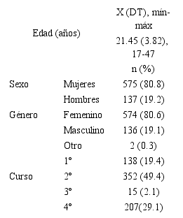 En la Tabla 2, se presentan los datos sociodemográficos y académicos de la muestra de estudiantes. La mayoría estaban cursando el segundo curso (49,4%) del Grado de Maestro de Educación Primaria (52,70%) y de Educación Infantil (36%), mientras que los de tercero se encontraban en prácticas y fueron minoría. Los estudiantes de 4º curso (27,50%) se estaban especializando principalmente en Educación Especial, Educación Física y Lenguas Extranjeras. El rango de edad variaba entre los 17 y los 47 años (edad = 21,45 años; DT = 3,82), el 80,8% eran mujeres (n = 575) que en su mayoría se identificaron con el género femenino.