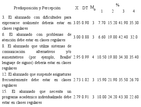Resultados sobre predisposición y percepción ante la inclusión