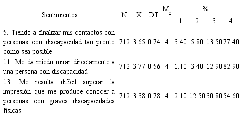 Los estudiantes presentaron sentimientos adecuados hacia las personas con diversidad funcional, la media fue relativamente alta (3.60), y la moda se correspondió con el valor máximo (cfr. Tabla 5). La dispersión no resulta excesiva (0.68), por lo que se puede aseverar cierta consistencia respecto de las respuestas señaladas.