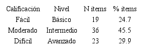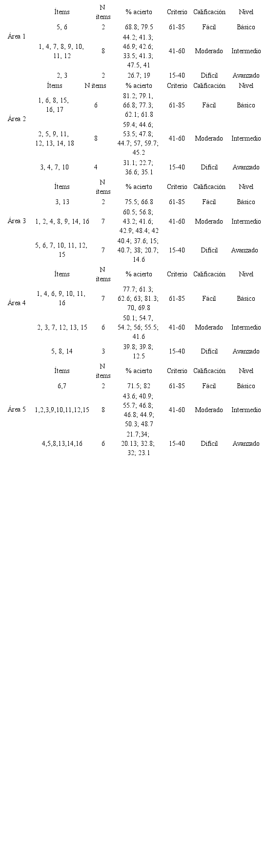 En las tablas 9 y 10 se presentan las estructuras de cada una de las pruebas de las diferentes áreas competenciales. Un total de 78 ítems divididos en básicos o fáciles (+60% de aciertos), intermedios o moderados (entre 40% y 60% de aciertos) y avanzados o difíciles (menos de 40% de aciertos).