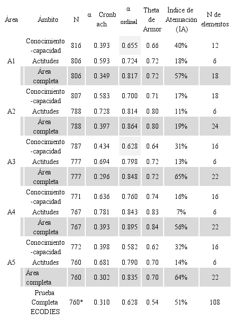 Para comprobar la fiabilidad, tanto de la prueba completa como de las pruebas de acuerdo con los ámbitos de conocimiento, capacidad y actitud, se calcularon el índice α de Cronbach y el αordinal o modelo de factor común, como medidas de consistencia interna (Welch & Comer, 1998), además del coeficiente Theta de Armor (modelo de componentes principales). Estos últimos se consideran más apropiados para escalas de menos de cinco categorías o ítems dicotómicos, como el caso que nos ocupa. Para los análisis de la escala de actitud tipo Likert, compuesta por 6 ítems, con opciones de respuesta de 1 a 5; la puntuación de los ítems se recodificó, asignando 1 (positiva) para las alternativas 4 y 5, y 0 (no positiva) para 1, 2 y 3. El αordinal y Theta de Armor se calcularon en base a las correlaciones tetracóricas y los pesos factoriales rotados, siguiendo las indicaciones y la hoja Excel de Domínguez-Lara (2018).