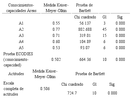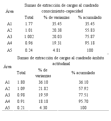 En el análisis de componentes principales se calcularon los valores para cada uno de ellos, conservando los factores cuyo valor es de ≥ 1. Los ámbitos de conocimiento y capacidad en las cinco áreas explicaron más del 50% de la varianza (51.68%-68.66%) y el ámbito de actitud comprendió desde 48.32% hasta el 31.34%.