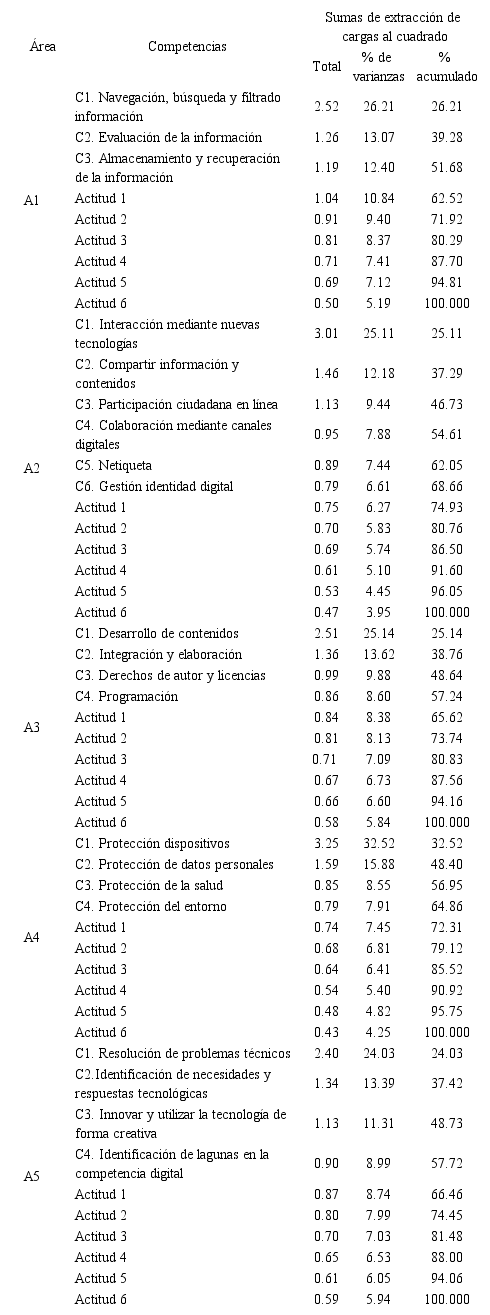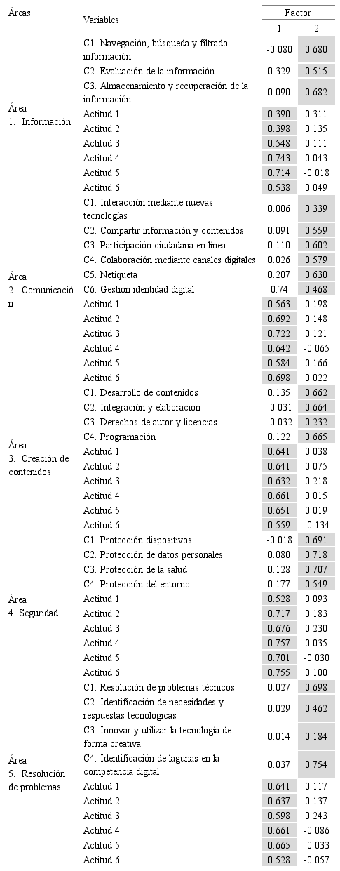 La mayoría de los ítems de las diferentes subáreas analizadas adquieren el peso suficiente, con valores >0.40 o muy próximos, lo que permitió ubicarlos en el mismo factor en el que fueron establecidos, tanto por los investigadores como por el comité de expertos que validó el contenido de la prueba. Los correspondientes al ámbito de actitud presentan una importante carga o valores altos a la hora de interpretar el factor, lo que llevó a considerarlos como determinantes para el mismo. Caben destacar dos valores consideraros bajos en los que se pueden interpretar que dos subáreas tienen un peso bajo (<0.40) dentro del factor [área 3 de Creación de contenidos, la subárea Derechos de autor y licencias (=0.232); área 5, Resolución de problemas, la subárea: Innovar y utilizar la tecnología de forma creativa (=0.184)].