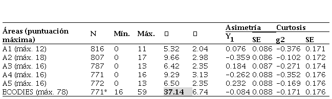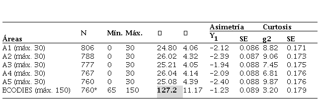 En todas las áreas de la escala, como se observa en la tabla 5, presentan una asimetría negativa (<0). Respecto a la curtosis, todas las áreas muestran puntuaciones superiores a 3 y en todos los casos positivas, por lo que pueden considerarse de distribuciones leptocúrticas.