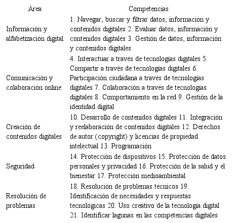 La Comisión Europea publicó en agosto de 2013 el Marco para el Desarrollo y la Comprensión de la Competencia Digital en Europa (DigComp 1.0) (Ferrari, 2013). Este modelo estructuraba las dimensiones de la competencia digital en cinco áreas, tres niveles y tres ámbitos. En junio de 2016, fue actualizado por el Marco Europeo para la Competencia Digital de los Ciudadanos (DigComp 2.0) (Vuorikari et al., 2016). Se mantenía la misma estructura del modelo anterior y se actualizaban las denominaciones, los conceptos y descriptores de la competencia digital. Este Marco de DigComp 2.0, fue actualizado en el año 2017. Surge DigComp 2.1. (Carretero et al., 2017). El principal cambio se dio en los niveles de dificultad que pasaron de tres a ocho, siguiendo la taxonomía de Bloom e inspirados en la estructura y el vocabulario del Marco Europeo de Calificaciones (EQF, por sus siglas en inglés) (figura 1). Este Marco cuenta con un total de 21 competencias digitales recogidas en la tabla 1.