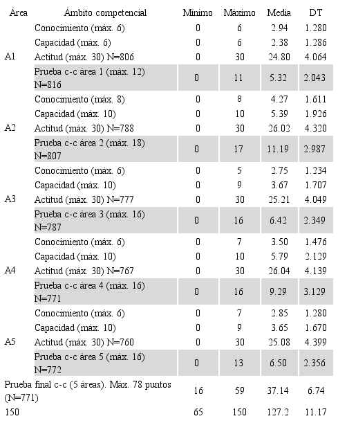En todas las áreas, se calculó la puntuación global tomando como referencia una escala de 0-10 puntos. Así, en el área 1, la puntuación global en los ámbitos de conocimiento y capacidad es de 4.40, situándose próxima al punto medio y alcanzando un nivel alto en las actitudes (8.26). En el área 2, la puntuación global en las áreas de conocimiento y capacidad es de 6.22, situándose por encima del punto medio y alcanzando un nivel muy alto las actitudes (8.68). En el área 3, la puntuación global en conocimiento y capacidad es de 4.01, situándose por debajo del punto medio y alcanzando un nivel muy alto en las actitudes (8.40). En el área 4, la puntuación global en los aspectos de conocimiento y capacidad es de 5.80, situándose por encima al punto medio y alcanzando las actitudes un nivel muy alto (8.80). En el área 5, la puntuación global en conocimiento y capacidad es de 4.06, se sitúa por debajo del punto medio y las actitudes alcanzan un nivel muy alto (8.36).