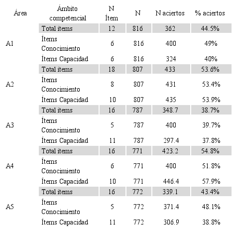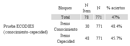 Teniendo en cuenta los porcentajes de acierto, ECODIES es una prueba equilibrada (tabla 8) porque la dificultad de las preguntas es similar, tanto en las de conocimiento como en las de capacidad. En las cinco áreas predominan los ítems de nivel intermedio o moderado (40%-60%), siendo estos los que mejor discriminan, y son pocos los que se sitúan en las categorías extremas (muy fácil-muy difícil).