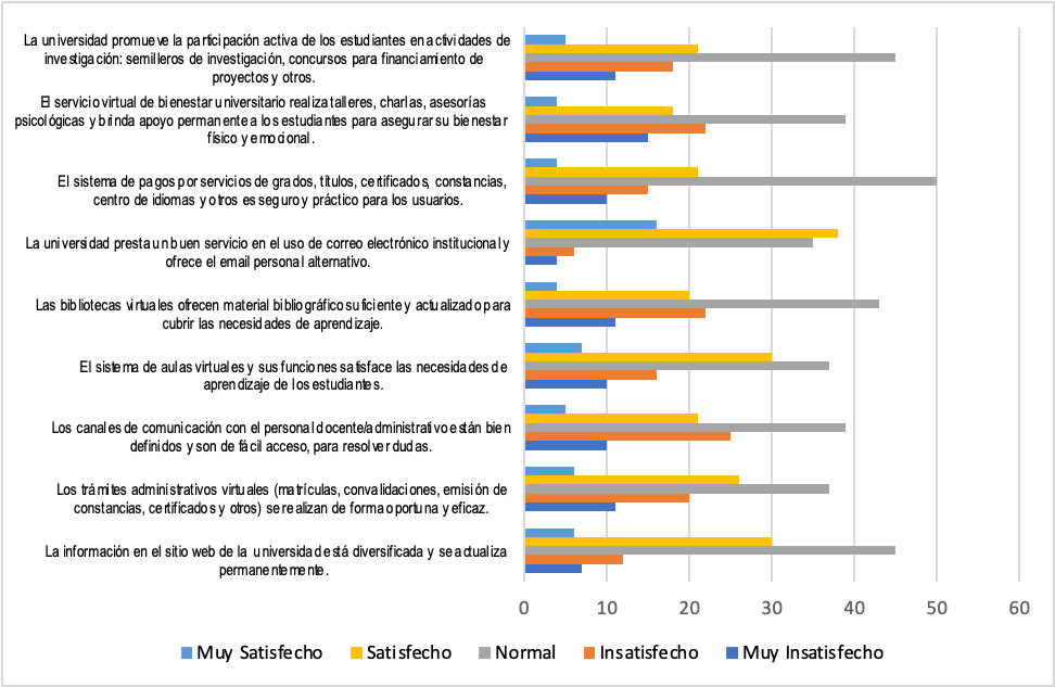 De modo general, estos resultados (Tabla 4) evidencian aspectos positivos, ya que los niveles normal-regular (42%), satisfecho (27%) y muy satisfecho (5%) demuestran que los estudiantes están conformes con los servicios educativos generales, recursos tecnológicos con los que cuentan, desempeño y actitud de los docentes y con los procesos virtuales de enseñanza-aprendizaje.