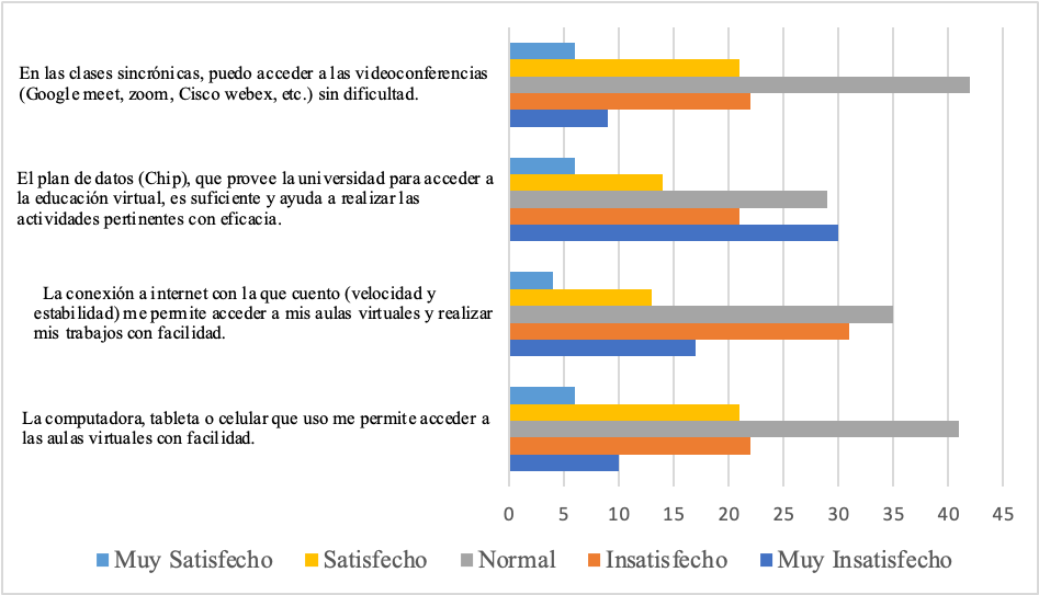 Adicionalmente, estos resultados, comprueban que uno de los grandes problemas que los estudiantes enfrentan en el contexto de la educación virtual se refiere a los recursos tecnológicos necesarios para estudiar en línea, principalmente los equipos: computadora, celular o tableta y el acceso a internet (Manrique & Sánchez, 2019), generando, en diversos contextos, insatisfacción con el servicio educativo que reciben los estudiantes universitarios.