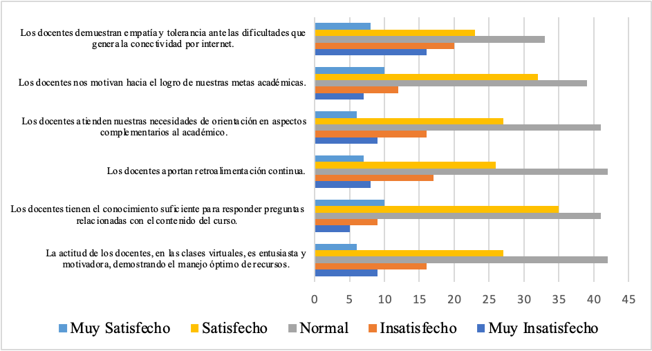 La satisfacción con el desempeño y actitud docente muestra resultados similares a los de Gavrilis et al. (2020) quienes identificaron una percepción positiva de los estudiantes acerca de su comunicación y colaboración con el profesor. Adicionalmente, se valora la actitud de los docentes al enfrentar un nuevo panorama, coincidiendo en que “cada docente ha tenido que utilizar sus medios, su esfuerzo personal, sus saberes y competencias disponibles para dar un servicio que en muchas ocasiones no había experimentado antes”(Del Castillo-Olivares & Del Castillo-Olivares, 2021, p. 99)