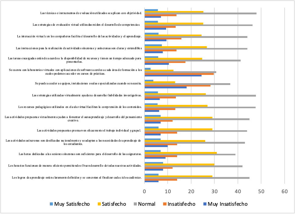 Por otra parte, el aspecto que genera mayor insatisfacción se refiere a que no se cuentan con laboratorios virtuales ni con softwares especializados que permitan realizar los cursos de prácticas, siendo esta una gran debilidad que se debe superar lo más pronto posible. Este aspecto coincide con Molina et al. (2021) quienes identificaron una escasa satisfacción estudiantil por la limitación del sistema para la realización de prácticas.