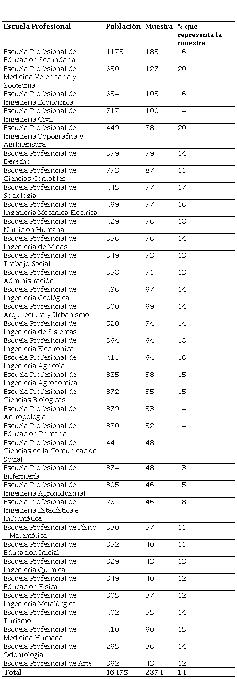 La población la constituyeron 16,475 estudiantes matriculados en el semestre 2021-I en las 35 escuelas profesionales que oferta la UNAP. La muestra resultó del total de respuestas obtenidas al Cuestionario de Satisfacción Estudiantil con la Educación Virtual Universitaria, cursado mediante correo electrónico institucional por los investigadores, con autorización expresa del Vicerrectorado de Investigación de la UNAP. Dicho cuestionario estuvo disponible durante 30 días calendario (del 24 de agosto al 24 de setiembre de 2021) y se cerró al superar el rango del 10% de la población total; considerando a 2,374 estudiantes como parte de un muestreo probabilístico aleatorio simple. Se precisa que, en el correo electrónico enviado a los estudiantes, se adjuntó el formato de consentimiento previo e informado, destacando el carácter voluntario, anónimo y confidencial de la información. De modo general, la muestra representa el 14% de la población (Tabla 1). De modo específico, el porcentaje de estudiantes que conformaron la muestra en cada escuela profesional oscila entre 11 y 20% del total.