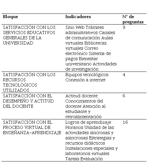 Para recoger datos se utilizó el Cuestionario de Satisfacción Estudiantil con la Educación Virtual Universitaria, con una escala de Likert, diseñado a partir de las propuestas de Molina et al. (2021); Sánchez (2018); Van et al.(2020) y Nurunnami & Abdelhadi (2019) 2019. Este instrumento, que constó de 35 ítems se aplicó a través de Google Forms, durante el último mes del semestre académico 2021-I. Se abordó la satisfacción de los estudiantes en relación a cuatro componentes, incluidos en el servicio que ofrece la UNAP: 1) servicios educativos generales, 2) recursos tecnológicos, 3) desempeño y actitud del docente y 4) proceso virtual de enseñanza-aprendizaje (Tabla 2). El instrumento fue sometido a un proceso de validación a través de juicio de expertos, comprobándose su validez de contenido y constructo con el coeficiente V de Aiken = 0.9. Así mismo, se calculó la confiabilidad del instrumento con el coeficiente Alfa de Cronbach = 0.972, comprobándose su alta fiabilidad.