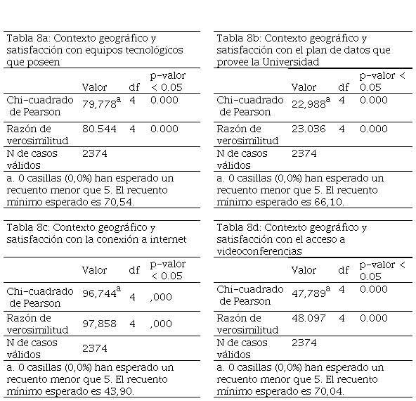 En esta dimensión, se destacan aspectos que son considerados en un nivel muy insatisfactorio, tal como se muestra en la Figura 2, siendo el principal aspecto que genera insatisfacción el plan de datos que provee la universidad para acceder a la educación virtual; que si bien es un aspecto que muestra la disposición positiva de las autoridades para ofrecer internet gratuito a estudiantes con el fin de acceder al servicio educativo (Paredes-Chacín et al., 2020); este es considerado, por los estudiantes, insuficiente para realizar sus actividades con eficacia, puesto que no les permite acceder libremente a bibliotecas virtuales mundiales, redes sociales y otras aplicaciones consideradas necesarias para concretar sus procesos de aprendizaje, limitando la posibilidad de disponer de una gama de recursos tecnológicos imprescindibles para el desarrollo educativo (Escobar-Mamani & Gómez-Arteta, 2020). El otro aspecto que genera insatisfacción en los estudiantes es la velocidad y estabilidad de la conexión a internet con la que cuentan, la cual no les permite acceder a las aulas virtuales y realizar sus trabajos con facilidad, esta situación es más alarmante en los estudiantes que se encuentran en zonas rurales (20% de los encuestados), quienes muchas veces se encuentran imposibilitados de acceder a la educación virtual por la inexistencia de conexión a internet en la zona de su residencia, teniendo que trasladarse a otros lugares para poder acceder al servicio educativo. Para darle mayor consistencia a estos resultados y verificar la asociación entre la satisfacción con los recursos tecnológicos y el contexto geográfico, se utilizó el estadístico Chi-cuadrado de Pearson, con un nivel de significancia del 95% y con un margen de error del 0.05%, obteniéndose para los cuatro indicadores de esta dimensión que el p-valor es menor que 0.05 (Tabla 8: a,b,c,d); por consiguiente, se afirma que existen diferencias estadísticas significativas entre la satisfacción de los estudiantes con los recursos tecnológicos y su contexto geográfico, rural o urbano.