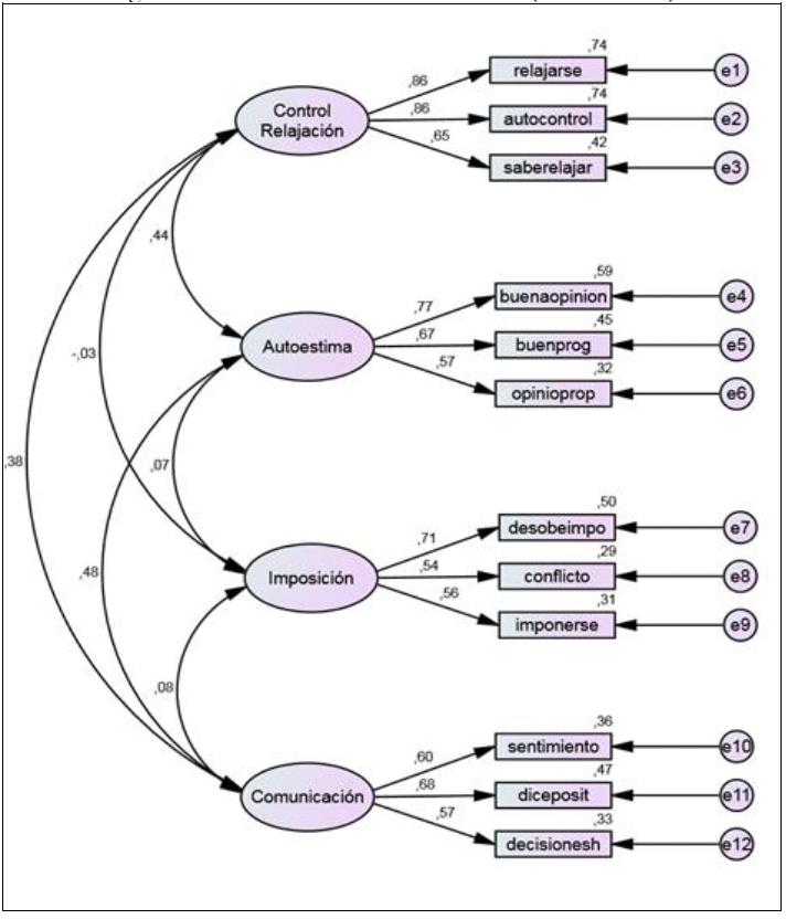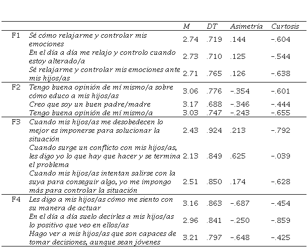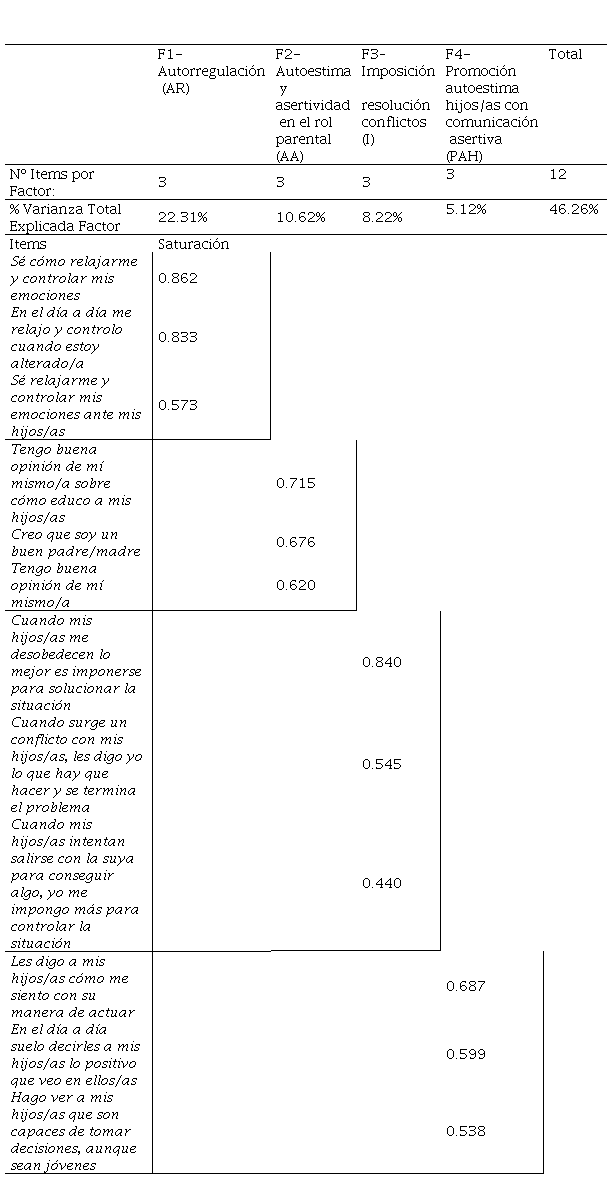 El porcentaje de valores perdidos en la base de datos estuvo entre 0,8% y 2,8%. El resultado de la prueba MCAR fue χ2 = 5010.875, DF = 4250, p =0.000, lo que indicaba que esos datos perdidos no eran completamente al azar. Por ello, se calculó la estimación de Esperanza-Maximización (EM) (Dempster et al., 1977; Pigott, 2001). Por su parte, revisada la normalidad de los ítems, se eliminaron seis que no cumplieron esta condición, por lo que el número final de ítems analizados fue 34. No se identificó entre ellos multicolinealidad (correlaciones < 0,90). El análisis factorial exploratorio (AFE) seleccionó doce ítems distribuidos en cuatro factores de tres ítems cada uno, que en conjunto explican el 46,26% de la varianza (KMO = 0.739 aceptable; Kaiser, 1974). La prueba de esfericidad de Bartlett fue significativa (χ2 = 1982,029; gl = 66; p = 0,000). Los factores seleccionados fueron: F1-Autorregulación (AR), F2- Autoestima y Asertividad en el rol parental (AA), F3-Imposición en la resolución de conflictos (I) y F4-Promoción de la autoestima en los hijos e hijas a través de la comunicación asertiva (PAH) (Tabla 1).