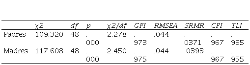 Para probar si el modelo permanecía estable al considerar el sexo, se repitió el análisis factorial confirmatorio con las submuestras de madres (n = 752) y de padres (n = 670). Los resultados obtenidos muestran un buen ajuste del modelo en ambos casos (Tabla 3).
