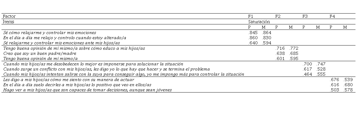 En ambas muestras, todos los ítems alcanzaron una saturación adecuada en su factor (Tabla 4), y se obtuvieron intercorrelaciones bajas entre los cuatro factores, lo que indica una adecuada validez discriminante (r entre 0.04 y 0.49 para los padres y r entre 0.02 y 0.57 para las madres).
