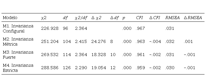 Dado que el modelo con cuatro factores presentó un buen ajuste, tanto para los padres como para las madres, se realizó el análisis factorial confirmatorio multigrupo (MGCFA) para probar la invarianza factorial del modelo en función del sexo. Los resultados muestran una estricta invarianza factorial, ya que no se encontraron diferencias en el ajuste de los modelos anidados. Esto se indica en la Tabla 5, que muestra que, en todos los casos, ∆CFI es inferior a 0.01 y ∆RMSEA es inferior a 0.015.