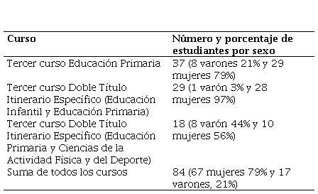 Los participantes fueron ochenta y cuatro docentes en periodo formativo, siendo la presencia femenina predominante. Hasta un 79% de mujeres constituyeron la muestra del estudio, refrendando la tendencia que suele acontecer en este tipo de titulaciones. Dichos participantes correspondieron a tres Grados diferentes. Como se puede comprobar en la tabla número uno, hubo alumnado perteneciente al Grado de Educación Primaria (tercer curso); al tercer curso del Doble Título Itinerario Específico que comprende Educación Infantil y Educación Primaria; y, por último, estudiantes correspondientes al tercer curso del Doble Título Itinerario Específico que comprende Educación Primaria y Ciencias de la Actividad Física y del Deporte. La distribución que se puede apreciar en la tabla fue pareja y atendió a la presencia de los estudiantes en el aula el día que tuvo lugar la experiencia que facilitó la recogida de datos que describiremos más adelante. Fue un muestreo intencional ya que, se seleccionaron esas clases de antemano.