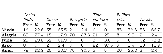 Como se ha reseñado, la meta era identificar seis emociones: miedo, alegría, furia, asco, amor y tristeza, a través de los diferentes álbumes ilustrados que han sido brevemente descritos. Se intervino en el aula y se leyeron las diferentes historias. Posteriormente, mediante un sencillo instrumento se recabó la información relativa a la percepción de las emociones. Este se basó en el ya realizado por Iglesias-Cortizas et al. (2018) e incluía dos partes: una inicial donde, sobre cada historia se planteaba una escala compuesta por los descriptores: nada, en algún momento, bastante o mucho, relativa a cada una de las emociones que se podían experimentar con cada uno de los álbumes presentados y leídos. Y, una segunda parte donde, independientemente de la experimentación previa, tenían que señalar aquellas emociones que creían que se cumplían en las historias narradas. La combinación de ambas fases (con clara predominancia de la segunda), determinó los resultados obtenidos para la constatación de la posible identificación de emociones por parte de las personas participantes en el estudio. Es importante reseñar que no conocían ninguno de los textos, factor importante para determinar el valor de los resultados obtenidos.