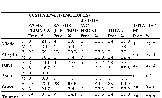 Si analizamos separadamente el álbum ilustrado Cosita Linda (tabla 3), observamos que atendiendo a las distintas titulaciones todas detectan el amor y la alegría como emociones fundamentales, pudiendo identificar porcentajes altos en las respuestas de todo el alumnado de los grados referidos. Esto corrobora la globalidad de respuestas, si bien es cierto que se destacan las respuestas de la doble titulación de Educación Infantil y Primaria donde la totalidad identificó el amor frente al resto donde existe algo más de diversidad.