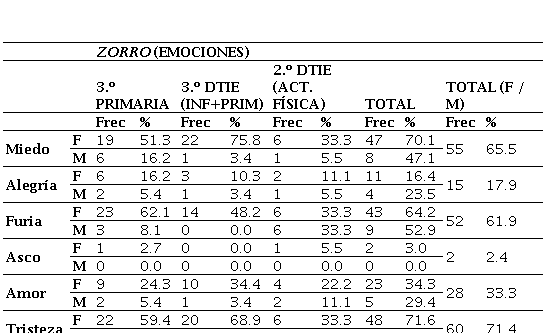 En lo que concierne a la obra Zorro (tabla 4), comprobamos que es la emoción referida al miedo la que posee unas cifras significativas. Su porcentaje junto a la tristeza es el más alto desde la perspectiva global, pero la variación entre titulación y género es resaltable. Esto es, nuevamente la doble titulación de Educación Infantil y Educación Primaria sobresale con respecto de las otras dos; y es destacable la diferencia de apreciación entre el sector femenino y el masculino, denotándose en este último un menor señalamiento.