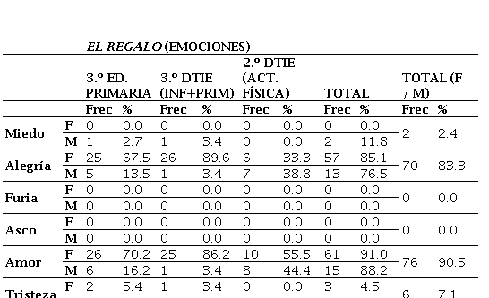 Analizando el caso del álbum ilustrado El regalo (tabla 5), observamos que, tanto el amor como la alegría, destacan en los globales. Continúa la línea uniforme mostrada por la doble titulación de Educación Infantil y Educación Primaria aunando altos porcentajes en las dos emociones. Los otros dos grados coinciden en la emoción referida al amor, pero existe más diversidad en lo referido a la alegría. No se aprecian cifras dispares en las contestaciones diferenciadas en función del género.