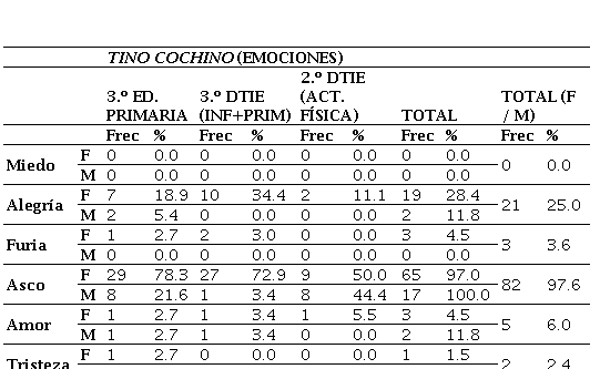 El análisis de este álbum, Tino cochino (tabla 6), no permite la obtención de datos significativos en la comparativa entre titulaciones o género de los estudiantes. Esto es debido a que la totalidad se decantan por la emoción o sentimiento de asco, dejando muy poco espacio para el resto. La alegría se disipa como segunda alternativa, siendo de nuevo la doble titulación de Educación Infantil y Educación Primaria, la que aporta una mayor cifra en este análisis de resultados.