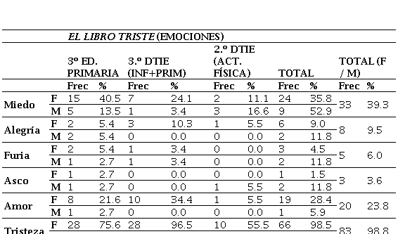 El análisis del quinto álbum ilustrado, El libro triste (tabla 7), arroja una percepción global centrada en el propio título de la obra. Este conduce a la emoción de la tristeza por unanimidad en las tres titulaciones y tampoco existe diferenciación en función del género. Sí que existe por parte del alumnado de Grado en Educación Primaria una cifra reseñable dirigida a la emoción del miedo y las estudiantes de la doble titulación en Educación Infantil y Educación Primaria detectan amor en este texto.