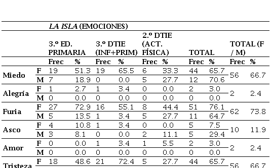 Tres son las emociones que destacan a partir del análisis de la obra, La isla (tabla 8): tristeza, miedo y furia. Se destaca más este último por el número de respuestas, constatándose el texto como uno de los que más pluralidad de emociones suscitó. En el análisis por titulaciones, en este caso la que se corresponde con la doble titulación de Educación Infantil y Educación Primaria opta más por la tristeza mientras que los estudiantes de Educación Primaria se decantan un poco más por la furia, también lo muestran con el miedo, mientras que la doble titulación de Ciencias de la Educación Física y del Deporte y Educación Primaria se mantiene con una distancia equilibrada con las cifras de los otros dos Grados. No existen al igual que en los textos anteriores diferencias reseñable en las respuestas clasificadas en función del género del alumnado.