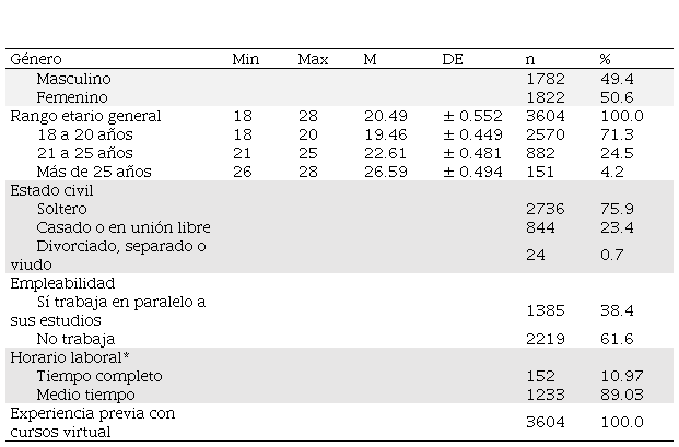 En la Tabla 1 se identifica el perfil de filiación de los participantes (N = 3604, DE ± 0.502), donde participaron 1782 varones (49.4%) y 1822 mujeres (50.6%), todos alumnos inscritos en la Universidad Autónoma de Tamaulipas, durante el tercer periodo escolar del 2021. Todos los participantes poseían la mayoría de edad. Se puede encontrar que el porcentaje de género fue equivalente, y que más del 70% fueron estudiantes situados en un rango etario de 18 a 20 años. Un porcentaje mayoritario (75.9%) de la población estaba soltera, y más del 38% se encontraba empleada durante el momento de la recopilación de datos. De este porcentaje de la población, más del 80% trabajaba de medio tiempo en paralelo a sus estudios, y solo un poco más de 10% laboraba de tiempo completo. Todos los participantes aceptaron contar con experiencia previa en cursos virtuales.