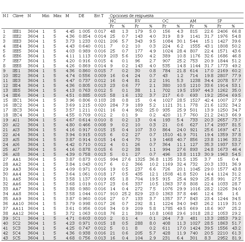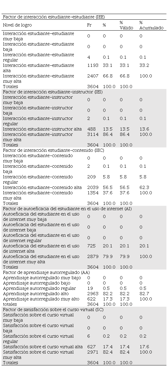 Se establecieron niveles de logro equitativos para cada factor del instrumento (Tabla 3), que se elaboraron con base en el rango del puntaje total de cada reactivo, que tuvieron un valor máximo de cinco puntos de acuerdo a los intervalos de opciones de respuesta (como se ha observado). Los niveles de logro se adaptaron en distintas categorías: 1) Interacción estudiante-estudiante (“IEE muy baja” [R=1-8], “IEE baja” [R=9-16], “IEE regular [R=17-24], “IEE alta” [R=25-32], y “IEE muy alta” [R=33-40]); 2) Interacción estudiante-instructor (IEI muy baja” [R=1-6], “IEI baja” [R=7-12], “IEI regular [R=13-18], “IEI alta” [R=19-24], y “IEI muy alta” [R=25-30]); 3) Interacción estudiante-contenido (IEC muy baja” [R=1-4], “IEC baja” [R=5-8], “IEC regular [R=9-12], “IEC alta” [R=13-16], y “IEC muy alta” [R=17-20]); 4) Autoeficacia en el uso de internet (“AI muy baja” [R=1-8], “AI baja” [R=9-16], “AI regular [R=17-24], “AI alta” [R=25-32], y “AI muy alta” [R=33-40]); 5) Aprendizaje autorregulado (“AA muy baja” [R=1-12], “AA baja” [R=13-24], “AA regular [R=25-36], “AA alta” [R=37-48], y “AA muy alta” [R=49-60]); 6) Satisfacción sobre el curso virtual (“SC muy baja” [R=1-5], “SC baja” [R=6-10], “SC regular [R=11-15], “SC alta” [R=16-20], y “SC muy alta” [R=21-25]).